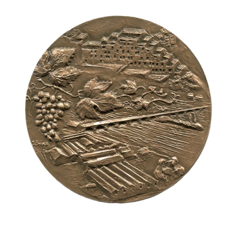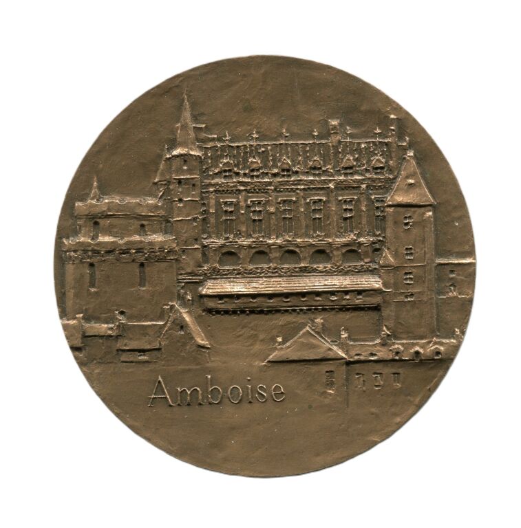 AMBOISE (37) - médaille de table ronde 68 mm - 173 grammes - Frappe Monnaie de Paris, bronze poinçon corne 1977 . - OEuvre haut relief de Janine BOYER - 1935-2003, 1er grand prix de Rome 1963. Vue du château de face, prise depuis le fleuve - Au revers : grappe de raison et ses feuilles. Au centre la Loire, fleuve royal ; au premier plan bâtiments d'usine de Négron, au fond quartier de la Verrerie d' Amboise.