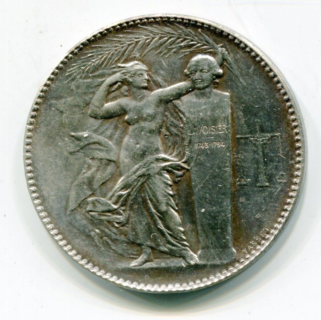 Médaille de récompense, Allégorie de la chimie représentée par une femme s'appuyant sur le buste d'Antoine LAVOISIER, père de la chimie moderne, buste inscrit de ses dates de naissance et mort 1743 / 1794 ; l'ensemble sur une couronne de palmes et, à gauche, balance inventée par Lavoisier, la balance la plus précise du temps.