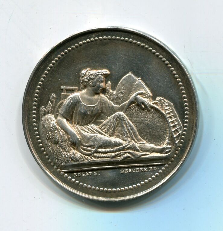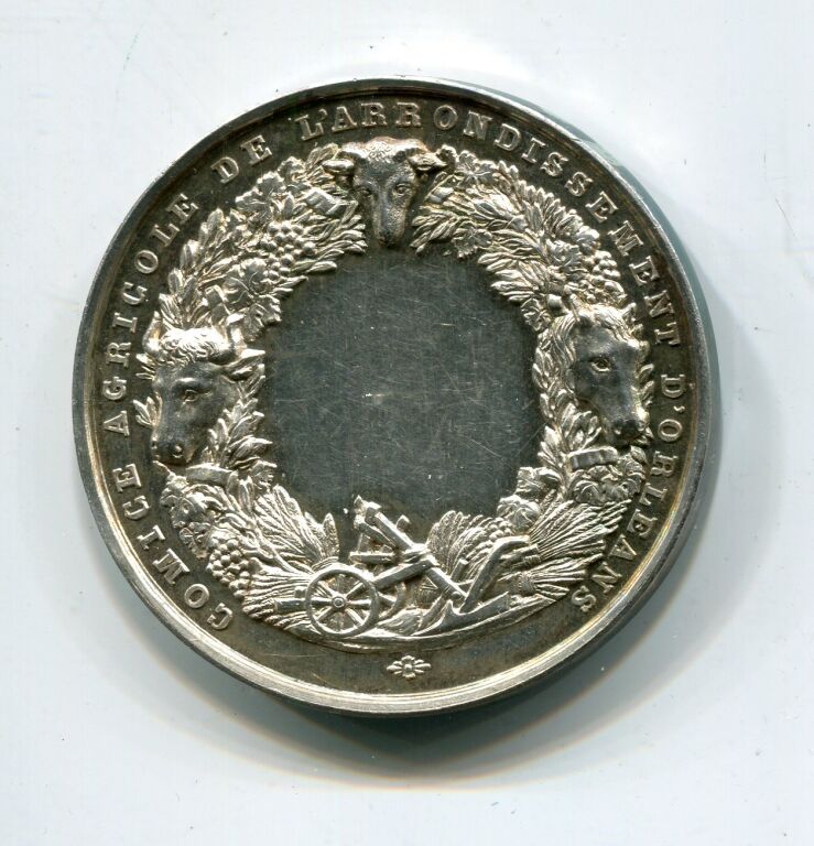 ARGENT - " COMICE AGRICOLE de L'ARRONDISSEMENT D' ORLEANS " NOUVEAU DESSIN modèle modifié, grande médaille de récompense classe argent en argent 42 mm - dans un cercle de points, Moissonneuse assise, serpe dans la main droite, bras gauche appuyé un panier à vanner, meules en arrière plan.- à l'exergue signatures ROCAT et BESCHER ed. - Revers : couronne de végétaux et têtes de bœuf, cheval, mouton + charrue ; centre pour attribution. -