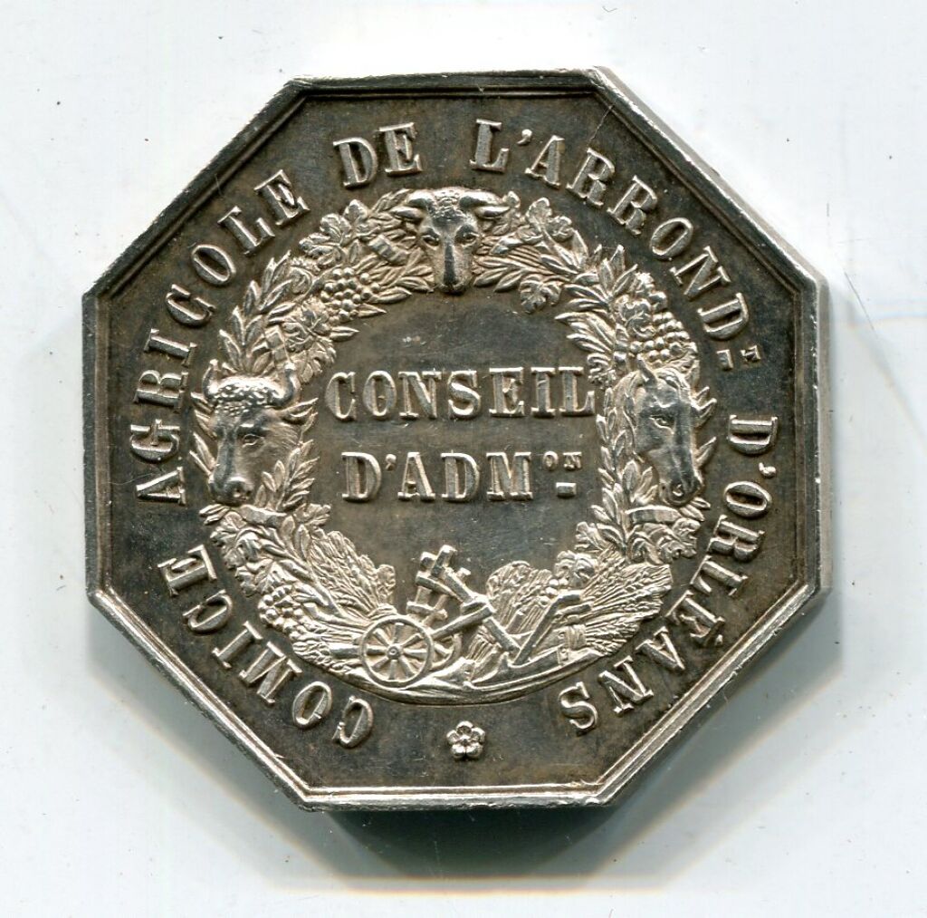 Jeton octogonal CONSEIL D'ADMINISTRATION en centre d'une couronne composée de symboles de l'agriculture : têtes de cheval, bœuf et mouron, charrue, épis de blé, vigne et laurier - à l'avers : OLIVIER DE SERRES ( * ) son buste de profil à gauche. Signature H. DE LONGUEIL sous le buste. - 31 mm - sur la tranche poinçons argent et main indicatrice 1845/1860) - 13,41 grammes - L/A n° 1126. - TTB