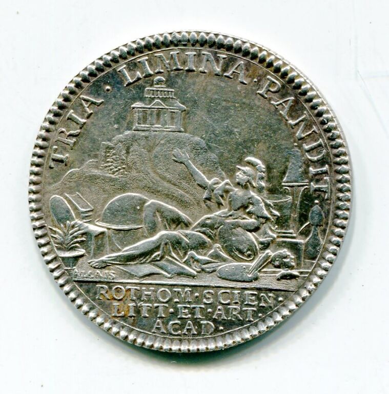 ARGENT - LOUIS XVI - ROUEN, ACADEMIE des SCIENCES - Jeton de présence " TRIA LIMINA PANDIT " (il ouvre trois portes), Minerve couchée à gauche au milieu d'objets d'art et instruments scientifiques montre de la main droite un temple placé sur un mont - à l'exergue : "ROTHOM. SCIEN. LITT ET ART ACAD." - gravure signée ALLAIS.- Revers : LUDOV XVI REX CHRISTIANISS buste du Roi drapé, profil à gauche, signé JP DROZ (défaut de frappe d'époque, balafre) - rare, frappe monnaie - 30 mm - 8,40 grammes - TB / TTB