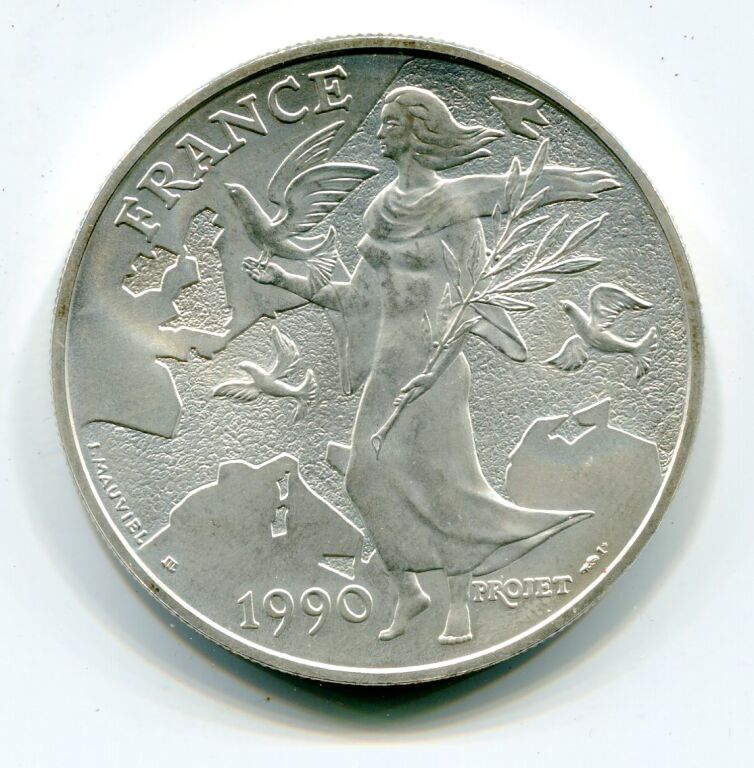 ARGENT - MEDAILLE EUROPA - Douze étoiles et douze blasons représentatifs des douze pays de l' Europe en 1990 - Revers : FRANCE 1990, représentation de la France debout sur carte de l'Europe, elle tient une colombe ailes déployées de la main droite, une branche d'olivier de la gauche ; également colombes en vol dans le champ.