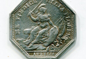 ARGENT - ORLEANS - JETON de MAIRE - " MAIRIE DE Mre F.A. CRIGNON DE BONVALET ECUYER 1786", ses armes couronnées entourées de 2 palmes - Revers : ME VINDICE LILIA FLORENT en légende circulaire. AURELLIA à l'exergue - En centre la Pucelle assise de face, cordelette autour de la taille, tenant épée de la main droite, la gauche appuyée sur le blason d'Orléans, faisceau de drapeau à l'arrière. (4 hampes)