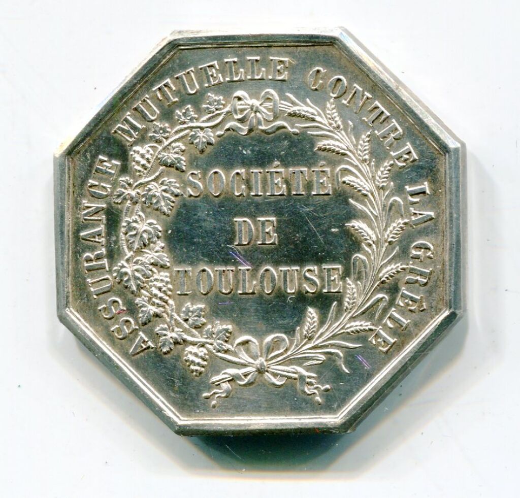 ARGENT - "SOCIETE de TOULOUSE / ASSURANCE MUTUELLE CONTRE LA GRELE", jeton de présence en argent 840 millièmes - blason de Toulouse couronné sur outils agricoles (faux, serpe, bêche, pelle, pioche …), gerbes de blé, cornes d'abondance remplies de fleurs - à l'exergue signé AUMOITTE et STERN - au revers titres en pourtour et à l'intérieur de deux palmes d'épis de blé et feuilles de vigne et grappes de raisin.