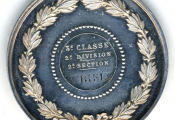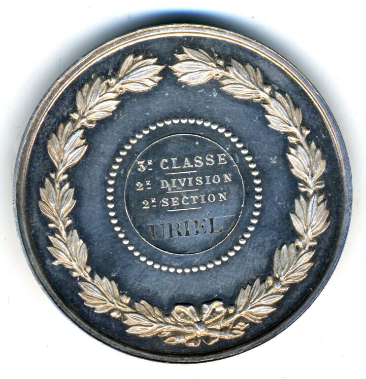 Médaille classe argent en argent, tête de cheval haut relief en centre, profil à gauche - Revers, attribution dans une couronne de laurier et cercle de points : " 3e classe, 2e division, 2e section URIEL ". - 42 mm -