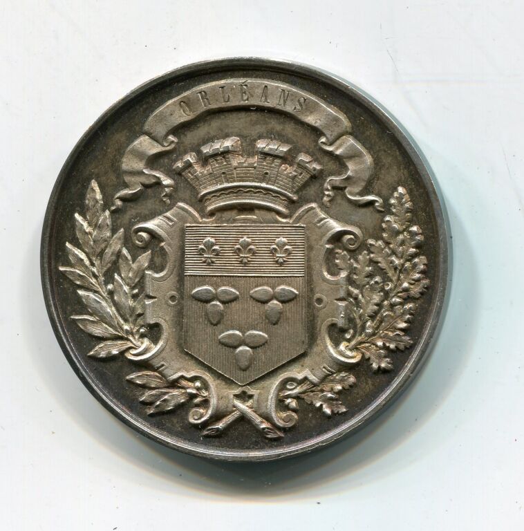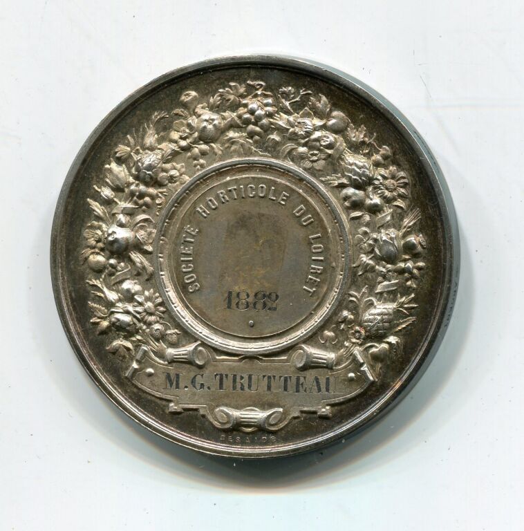ARGENT - " SOCIETE HORTICOLE du LOIRET ", médaille classe argent en argent. Ecu de ville couronné entre deux palmes de laurier et chêne - Revers, couronne de fruits, fleurs et céréales, attribution en centre : M.G. TRUTTEAU 1882 - signé Desaïde. - Poinçons argent et corne - 41,5 mm - 46,43 grammes - TTB
