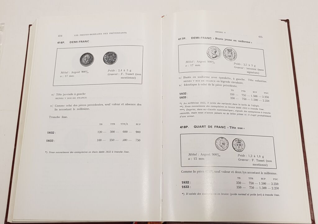 Ouvrage intéressant pour ses commentaires monétaires (histoire, faux répertoriés d' époque ou contemporains, notes diverses) - MAIS EGALEMENT pour son répertoire des MONNAIES de SIEGE lors de la période des révoltes de la Convention et son répertoire DES PSEUDO-MONNAIES des PRETENDANTS AU GOUVERNEMNT de la France qui frappèrent monnaies à l' usage de leurs partisans à titre de propagande : Napoléon II, Louis XVIII en exil à Gand, Henri V fils du Duc de Berry Duc de Bordeaux, Léon Gambetta, Adolphe Thiers, Mac Mahon, Général Boulanger, Napoléon IV ...