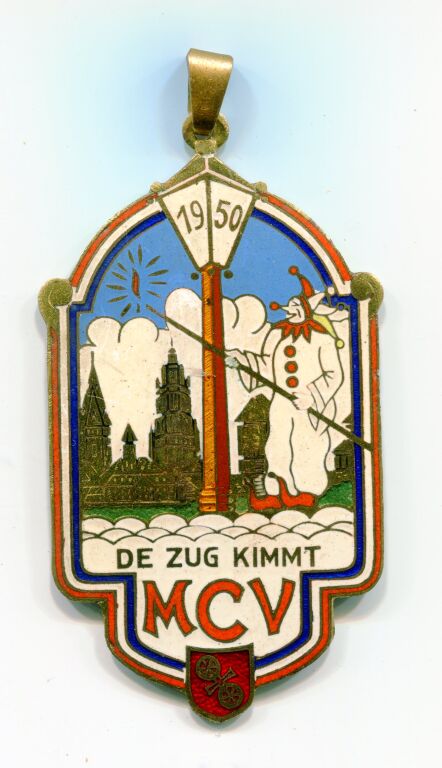 CARNAVAL de MAYENCE 1950 / ALLEMAGNE ( * )- Grande médaille / Insigne du comité - 82 x 45 mm - EMAIL GRAND FEU multicolore - en pourtour liseré tricolore, au fond quartier historique de Mayence, au milieu lampadaire, à droite carnavaleux en tenue de pierrot blanc en bas "DE ZUG KIMMT MCV (le train arrive) - Marquage fabricant au dos : MADLER MAINZ. - 35,05 grammes. - TTB