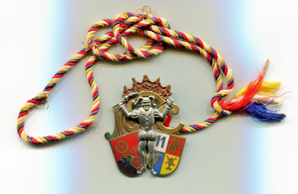 CARNAVAL de MAYENCE 1951 / ALLEMAGNE ( * )- Grande médaille / Insigne du comité - 60 x 49 mm - EMAIL GRAND FEU multicolore - En centre carnavaleux en pied sur lettres MCC, au-dessus farandole d'enfants, à gauche blason de Mayence, à droite blason du comité - Marquage fabricant au dos : WEILAND MAINZ. - 27,41 grammes. -