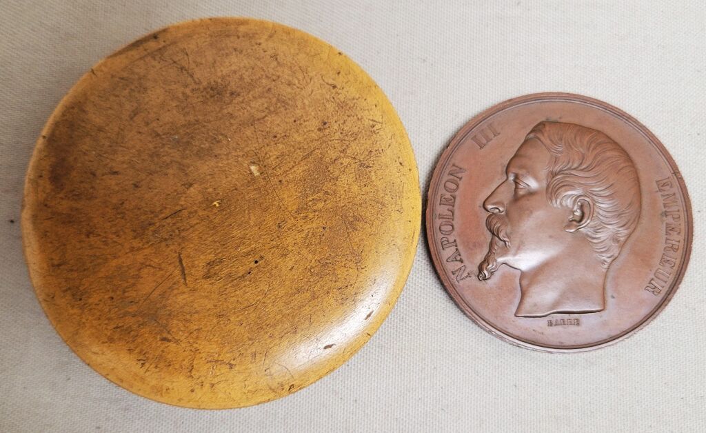 " COMICE AGRICOLE de L'ARRONDISSEMENT D' ORLEANS " grande médaille de récompense classe bronze en cuivre 50 mm - " NAPOLEON III EMPEREUR ", tête nue, haut relief, profil à gauche, signé BARRE. - Revers : titre et couronne de bouquets de feuilles de laurier, intérieur pour attribution. : " sur la tranche poinçons cuivre et abeille -