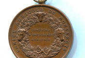 " COMICE AGRICOLE de MONTARGIS / CONCOURS D'ENSEIGNEMENT AGRICOLE", texte en centre de deux palmes de feuilles de chêne et de laurier, têtes de bœuf, cheval, mouton + charrue. - Revers : " J'AI TRAVAILLE / JE RECUEILLE, jeune femme assise tenant serpe de la main droite, ,main appuyée sur un panier à vanner ; au fond meules de paille - Médaille en cuivre 45 mm poinçon corne. - œuvre signée Rogat, Bescher ed -