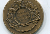 " COMICE AGRICOLE D'ORLEANS " - Scène de moisson , couple en action au milieu d'un champ de blé, charrette à chevaux au fond - Revers : décor sur un écu baroque : Têtes de cheval, bœuf, mouton, grappes de raisin, charrue et instruments agraires.
