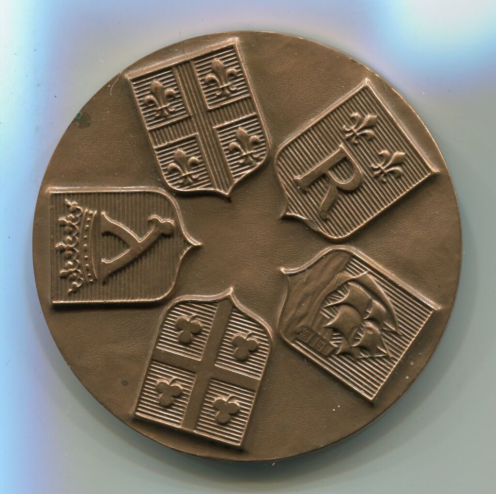 Vue des volcans, du Puy de Dôme et son relais hertzien, de vestiges historiques, lac. Revers : 5 blasons des principales villes du département - OEuvre d'Émile Rousseau. Sur la tranche poinçons bronze et corne & année frappe 1974. - 189,86 grammes- SUP
