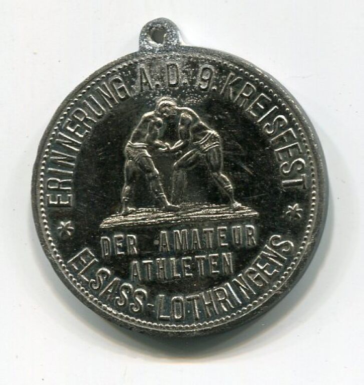 FRANCE / ALSACE / GUEBWILLER - PENCOTE 1907 - 9e FESTIVAL des ATHLETES et TOURNOI DE LUTTE AMATEURS - médaille souvenir avec bélière métal nickelé.