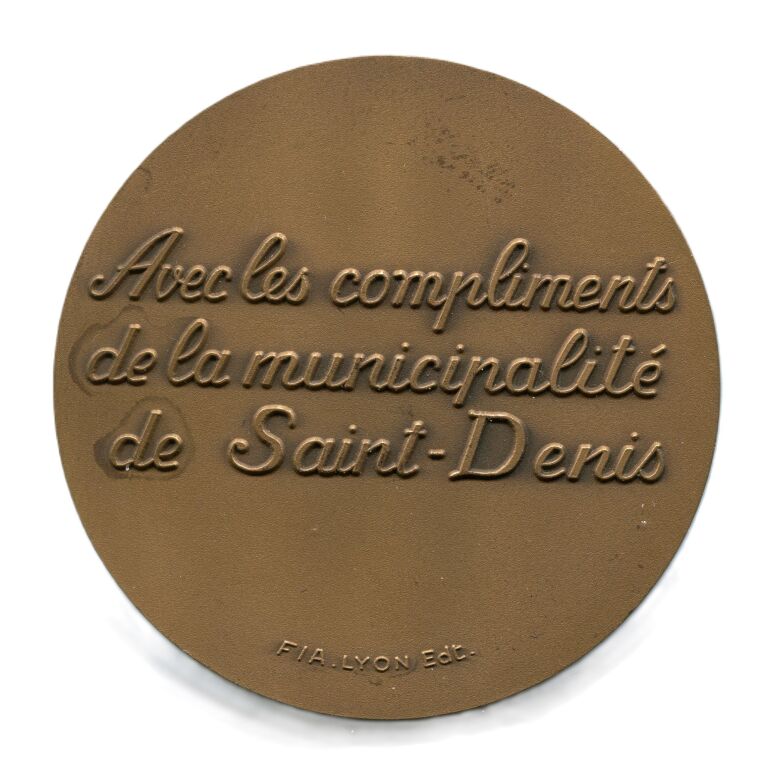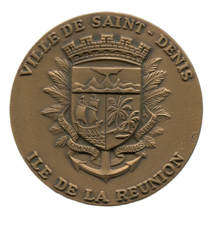 ILE de la REUNION - VILLE de SAINT DENIS - Médaille d' honneur de la ville, bronze ronde 72 mm - 165 grammes - OEuvre signée FIA Lyon ed - blason couronné de Saint Denis posé sur des palmes et ancre de marine. - Revers : "avec les compliments de la municipalité de St Denis.