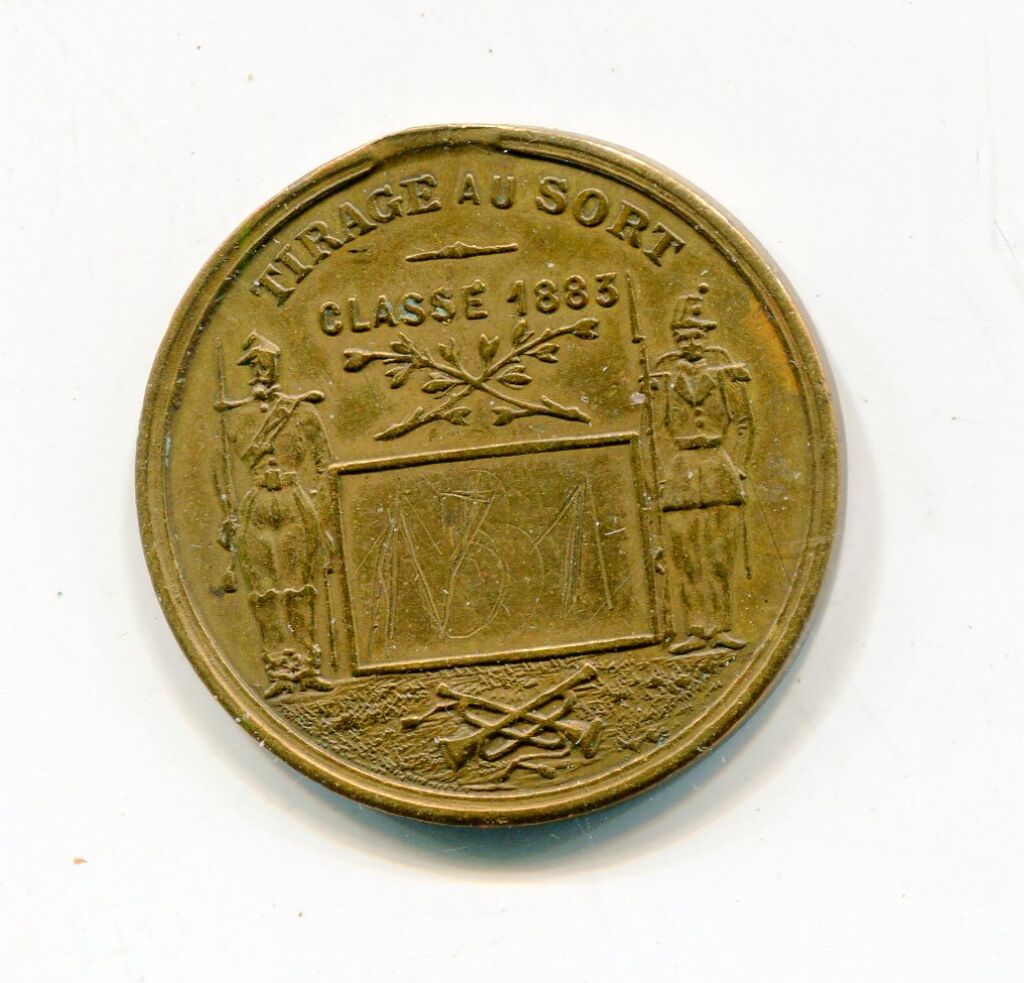 JETON TIRAGE AU SORT SERVICE MILITAIRE classe 1883 - ( * ) au module et à l'image de la dix centimes Cérès 3e République - "République Française", tête laurée de Cérès déesse des moissons profil à droite - Revers : "tirage au sort, classe 1883". - 2 soldats au garde à vous montent la garde de part et d'autre d'un rectangle, manuellement gravé n° 1 - au-dessus 2 palmes croisées, à l'exergue 2 clairons croisés.