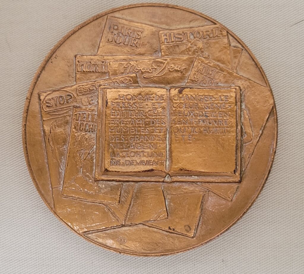 MEDAILLE de table grand module en MÉMOIRE de CINO DEL DUCCA (* ).son buste profil à droite par DROPSY ( ** ) mentions 1899 - 1967 Cino Del Duca - Revers : ses plus gros titres de journaux : " Paris jour, Historia, Intimité, Nous Deux, Mode de Paris, Stop, Télé poche " ; en centre livre ouvert où il est écrit : " Homme de presse et éditeur, célèbre ami des humbles et des Grands, ni l'âge ni la fortune ne devaient changer le cœur généreux de l'enfant pauvre qu'il avait été ".