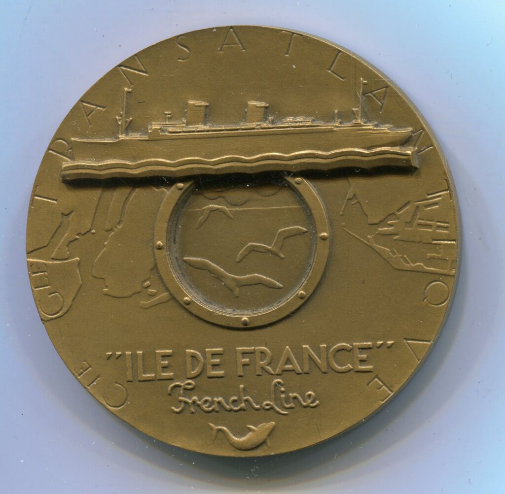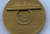 " PAQUEBOT ILE de FRANCE ( * ) " Médaille du navire et de la Compagnie Générale Transatlantique - La France assise de profil, seins dénudés, bras droit levé tendant une rose, bras gauche appuyé sur blason de France à 3 fleurs de lis, au-dessus grand navire du 16e trois mats, en pourtour blasons de la France ancien régime.