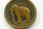 " PARIS / EXPOSITION COLONIALE INTERNATIONALE 1931 ", médaille en cuivre patiné bronze ELEPHANT de profil - Revers : ASIE, tête d'annamite en costume traditionnel, de face, œuvre signée MORLON - 32 mm - 18,87 grammes - TTB (petits chocs listel)