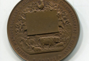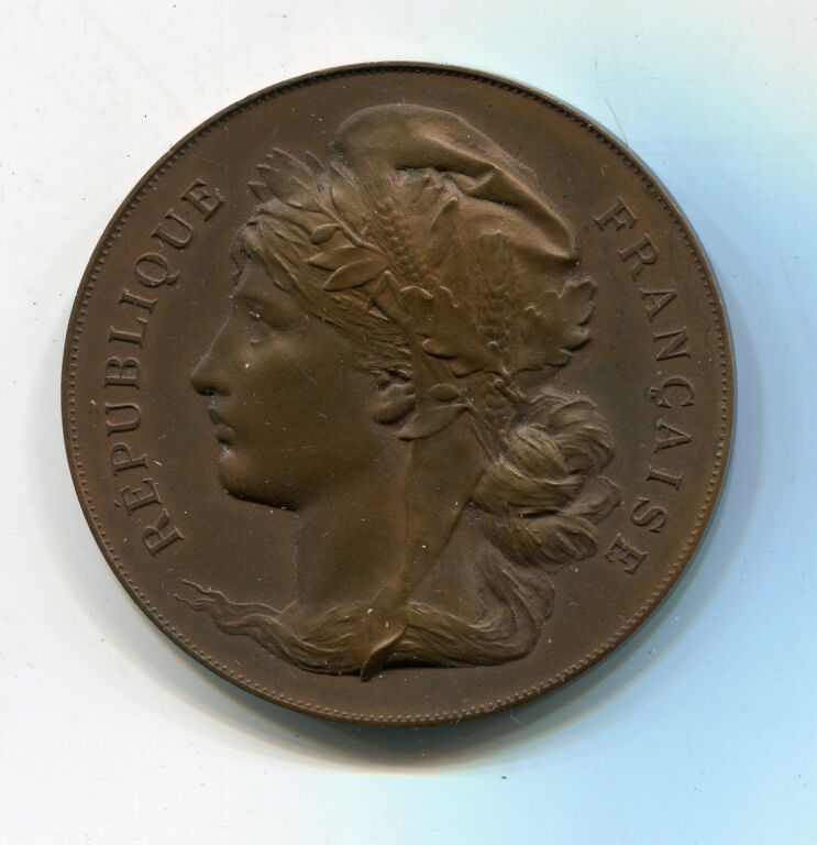 " SOCIETE D'ENCOURAGEMENT à L'AGRICULTURE de L'ARRONDISSEMENT D'ORLEANS / LOIRET " - République Française, tête coiffée du bonnet phrygien, laurée de laurier et d'épi de blé, profil à gauche - Revers : en centre cartouche pour attribution surmonté d'un coq et feuillage ; au-dessous ferme avec scène de labour, vache, mouton, cochon. Poinçon argent sur la tranche - grand module 50 mm en BRONZE patiné jaunâtre.