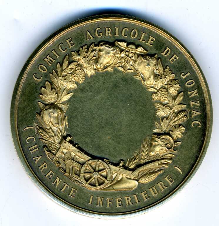 VERMEIL - COMICE AGRICOLE de JONZAC / CHARENTE INFERIEURE - Grande médaille classe or en argent doré, 50 mm - Femme vêtue à l'antique tenant serpe épis de blé, symbole de l'agriculture ; dans le champ corne d'abondance remplie de fruits et épis de blé à gauche, soc de charrue à droite - Gravure haut relief signée d'Eugène André OUDINE. - Revers : titre autour d'une couronne haut relief de fleurs, fruits, épis, têtes de bœuf, cheval, mouton, cochon, charrue et caducée. - sur la tranche poinçons argent et abeille.