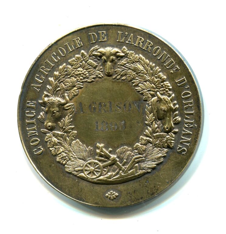 VERMEIL - " COMICE AGRICOLE de L'ARRONDISSEMENT D' ORLEANS " grande médaille de récompense classe or en argent doré 50 mm - intérieur de ferme avec basse-cour, au 1er plan femme debout portant un baluchon - Revers : couronne de végétaux et têtes de bœuf, cheval, mouton + charrue ; centre attribué à : A.GRISON 1895. - sur la tranche poinçons argent et corne - 61,33 grammes - L/A n° 1141 - Bescher ed - TTB