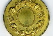 VERMEIL - " SOCIETE AGRICOLE ET INDUSTRIELLE LOUDUNOISE " grande médaille classe OR en argent doré - " REPUBLIQUE FRANCAISE " magnifique haut relief, La République assise de face, tête laurée étoile en dessus, tient main de justice de la main gauche et couronne de laurier de la droite ; à sa gauche coq gaulois debout. Posée sur un socle mention "Liberté-Egalite-Fraternité", œuvre signée A. BOVY.-