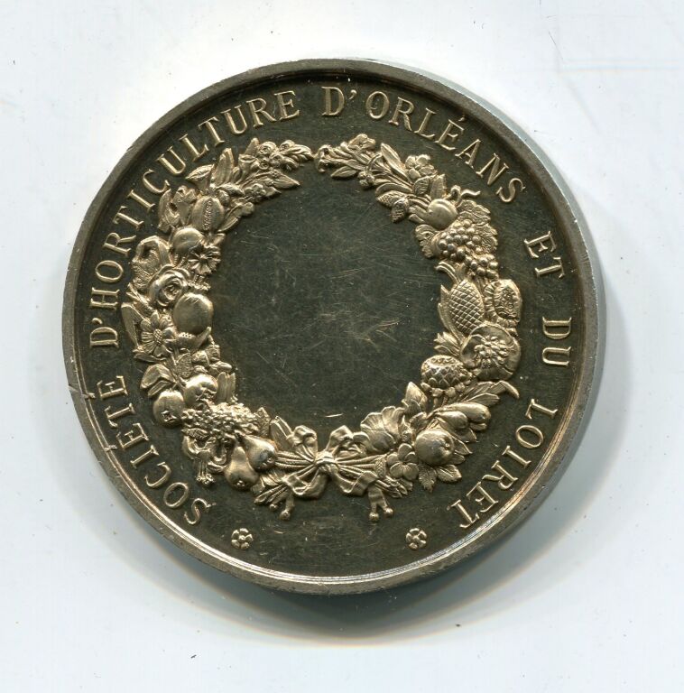 VERMEIL - " SOCIETE D'HORTICULTURE D'ORLEANS et du LOIRET ", Grande médaille classe or en argent doré 950 millièmes, couronne de fruits, fleurs et céréales, centre pour attribution.- " OLIVIER DE SERRES " épais listel, cercle de grenetis, en centre son portrait haut relief profil à gauche - sur la tranche poinçons argent 950 et tête de Minerve.
