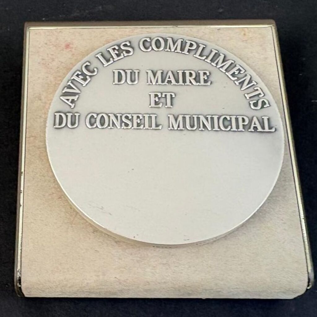 " VILLE D'AZAY le RIDEAU ", Médaille d'honneur de la ville -Très œuvre du médailleur Balme, divers attraits de la ville, vues en relief de l'hôtel de ville, le château, l'église, l'ensemble avec blason de ville couronné - En bronze patiné, le listel doré à l'or - Au revers, pour attribution, légende : "avec les compliments du maire et du conseil municipal '.