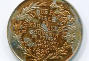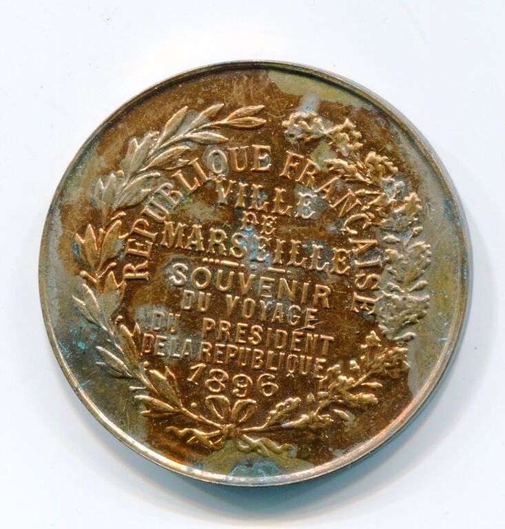 VILLE de MARSEILLE, SOUVENIR du VOYAGE du Président de la République FELIX FAURE le 17 janvier 1895 - Médaille / grand Jeton Laiton fourré 38 mm - légende et buste de face du président, au revers texte souvenir entre 2 palmes - 5,53 GRAMMES; ttb