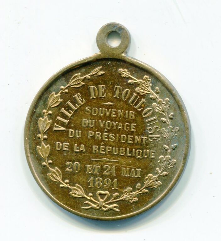 VILLE de TOULOUSE, CARNOT, Président de la République, SOUVENIR du VOYAGE, 20 et 21 mai 1891 - Buste 3/4 profil entouré de la légende, texte souvenir au revers entre 2 palmes.