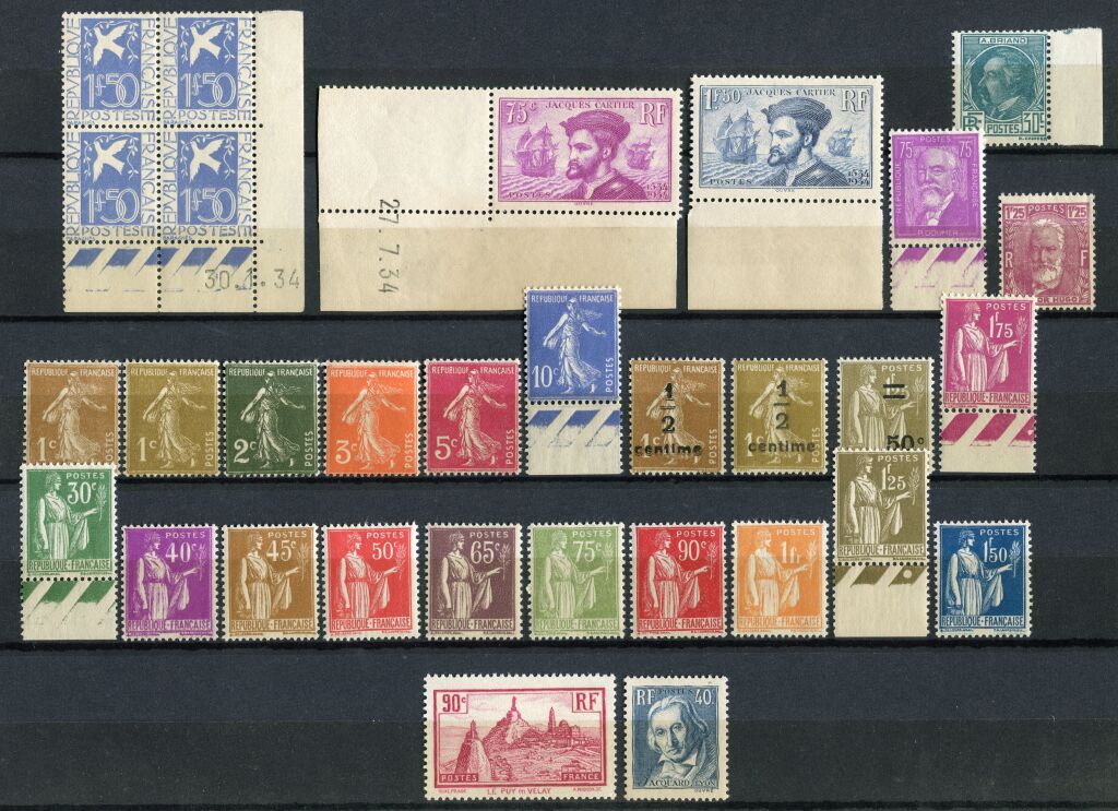 FRANCE- 1932 / 1934 - Ensemble complet des 28 timbres émis entre le n° 277 A et le numéro 298 … série Paix dont le 1 F 25 olive, personnages, Jacques Cartier, Colombe de la Paix etc.. Timbres neufs ** - important le n° 294 est BLOC de 4 COIN DATE