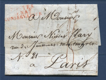 PREMIER EMPIRE - LE SENAT - RARE MARQUE de DEPART, frappe en rouge, texte 3 lignes, 13 x 42 mm, " POSTES / SENAT / CONSERVATEUR ". - ( Sénéchal n° 1122 ). - Pli en PORT DU daté du 12 février 1807 pour Paris, Taxe manuscrite à la plume à 6 Déci