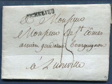FRANCE - MARCOPHILIE du 18e SIECLE - " RICHELIEU " (37) - Pli du 7 mars 1788 en port dû pour Lunéville " à Monsieur de St Côme, ancien gendarme Bourguignon " - Rare marque postale linéaire " Richelieu ", frappe en noir, 3,5 x 30 mm - Lenain n° 3.