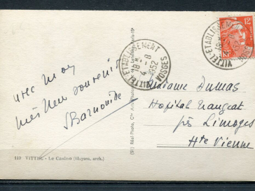Belle oblitération du " BUREAU D' INTERET PRIVE " ouvert au centre thermal pendant la saison de Mai à Septembre - cachet à date du 4 août 1952, au type A 4 utilisé de 1951 à 1956.