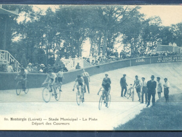 MONTARGIS (45) - CYCLISME - VELODROME circa 1925 - " stade municipal, la piste, départ des coureurs " - Gros plan animé coureurs, public, vélodrome.