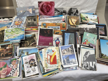 carton - ACCUMULATION environ 1 500 ( mille cinq cents ) CARTES POSTALES anciennes, semi-modernes, modernes. Surtout modernes, cartes touristiques mais aussi cartes des années 1980 /90. commémoratives d'illustrateurs et cartes de salons régionaux, do