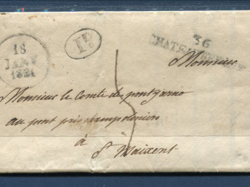 Beau pli en PORT PAYE pour Paris - Marque postale linéaire 2 lignes, 10 x 43 mm, frappe en noir, " P.36.P. / CHÂTEAU RENAUD " + présence de la griffe encadrée " Ps Ps " ( " port
