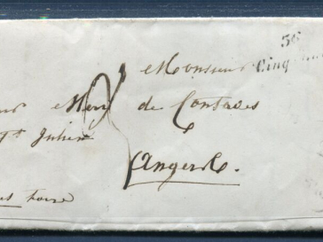 Pli en port dû pour Angers - Porte griffe en lettres cursives 2 lignes " 36 / CINQ MARS " + cachet d'origine rurale " OR " d