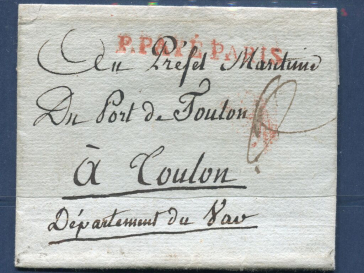 FRANCE - MARCOPHILIE du 18e SIECLE - Pli en PORT DU au départ de Paris du 24 septembre 1771 MARQUE POSTALE de DEPART grand P couronné, frappe en noir, 25 x 12 mm - Lettre d'affaires pour Messieurs Roux frères, négociants à Marseille.