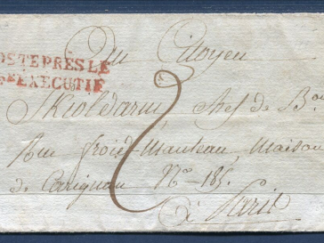 REVOLUTION FRANCAISE - DIRECTOIRE - RARE MARQUE de DEPART, frappe en rouge, texte 2 lignes, 10 x 49 mm, " POSTE PRES LE / D.re EXECUTIF ". - ( Sénéchal n° 875 a ). - Pli en PORT DU du 13 Vendémiaire l'an 7 ( 28 septembre 1798 ) pour Paris, Taxe ma