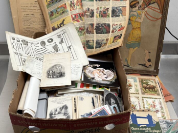 GROS VRAC A TRIER VIEUX PAPIERS : photos anciennes, buvards publicitaires, vieilles actions, almanach du facteur 1939 / 73, publicités diverses, almanachs et magazines, cartes postales, images Chocolat Poulain, images pieuses, affiches, menus, gravur