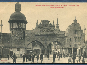 ROUBAIX (59) - EXPOSITION 1911 du NORD de la FRANCE ( * ) -"ENTREE du LUNA PARC" - Carte postale "officielle" des éditions Laffineur-Samin - Très gros plan animé, vue prise depuis l'intérieur de la place flamande, à droite la pâtisserie Meert.