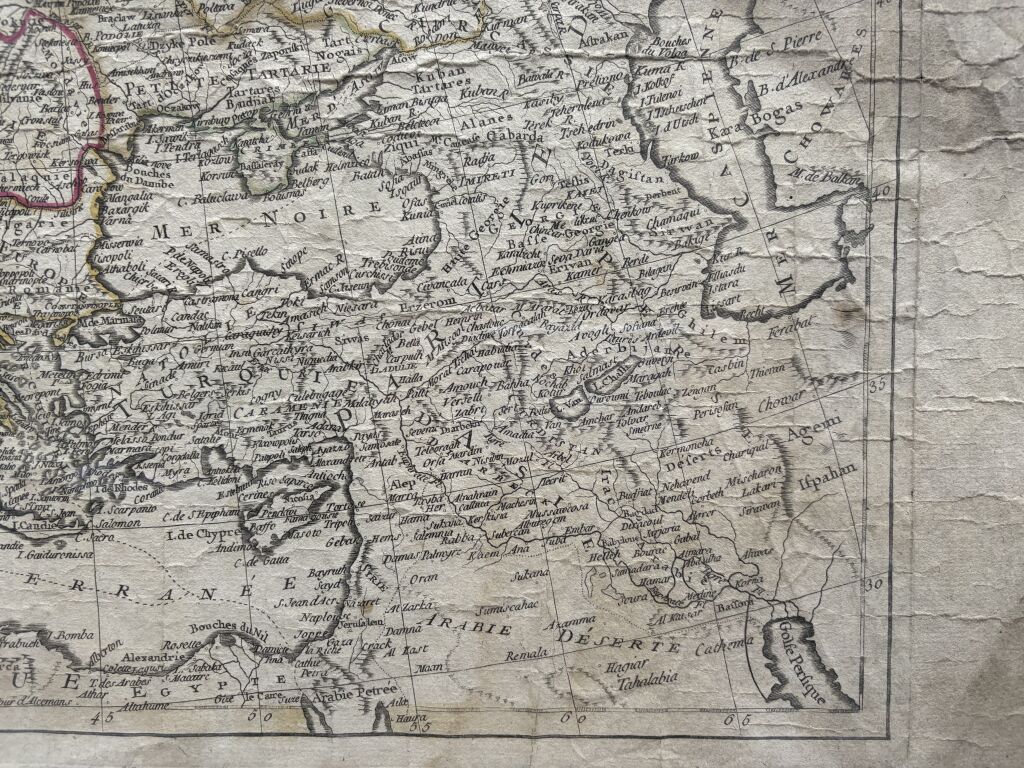 nota. La carte : impression assez fraiche mais salissures de poussière et petits défauts (voir photos), mais garde son intérêt tant pour son graphisme que pour ses enseignements cartographiques du 18e siècle.