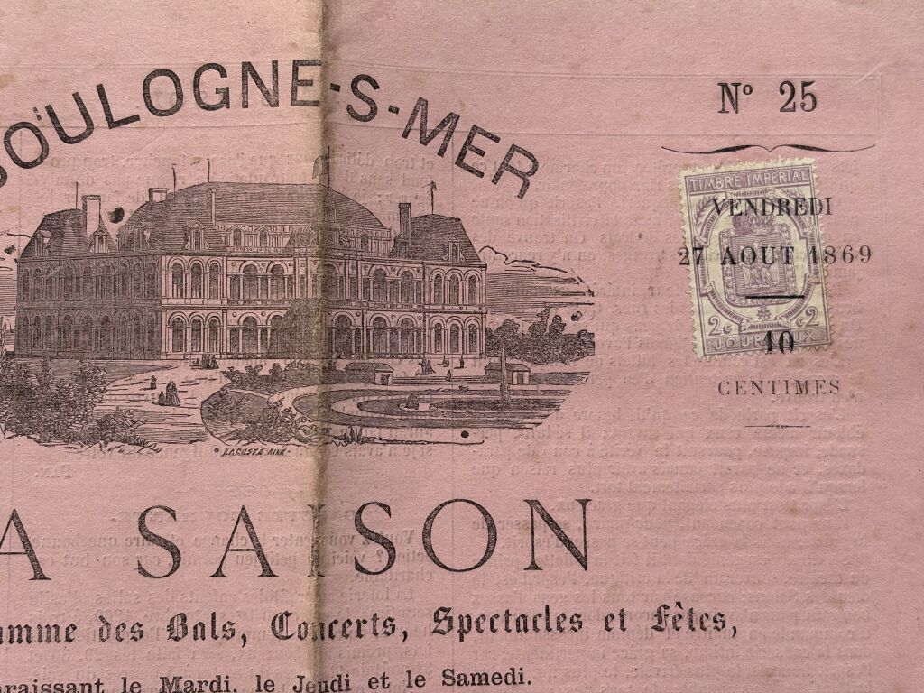 BOULOGNE SUR MER (62) - TIMBRES JOURNAUX sur JOURNAL ENTIER : timbre journal n° 7 "blason impérial ", 2c violet dentelé, timbre oblitéré par la typographie (l'imprimeur collait le timbre sur sa feuille de papier vierge et l'impression du texte annulait le timbre).