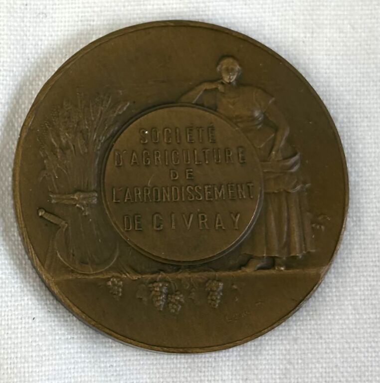 CIVRAY (86) - médaille de la SOCIETE D'AGRICULTURE de L'ARRONDISSEMENT… OEuvres du sculpteur Alphée Dubois suivant les dessins de Luc Oliver Merson. Avers : au 1er plan haut relief d'une vache couchée et cheval debout ; au fond moutons, oiseaux dans le ciel - Revers : titulature, gerbe d'épis de blé, paysanne, grappes de raisin.