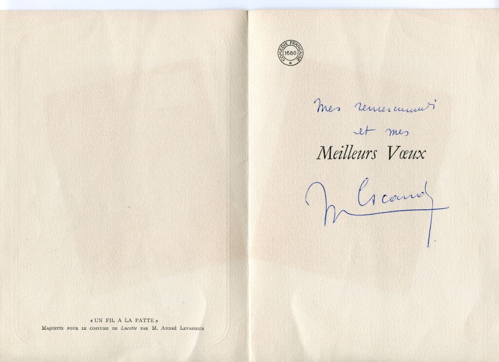 4 pages, format fermé 21 x 15 cm - en couverture aquarelle originale de la main de M. André LEVASSEUR, créateur des costumes, maquette pour le costume de LUCETTE du spectacle le FIL à LA PATTE ( ** ).