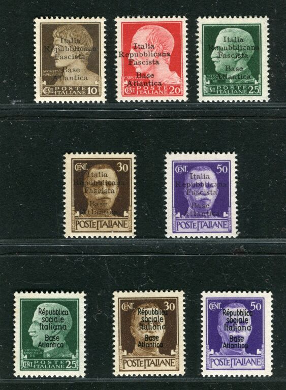 Timbres italiens à diverses effigies du Roi Victor Emmanuel avec surcharges noires " Italia repubblicana facista base atlantica " et " republica sociale italianna, base atlantica ".