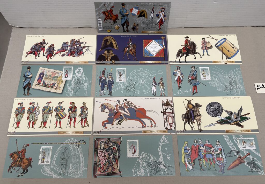 FRANCE 2012 - BLOCS COMMEMORATIFS SOUVENIRS " LES SOLDATS de PLOMB " . Collection complète de 6 feuillets individuels 205 x 95 mm, gommés, comportant chacun dans l' illustration un timbre dentelé - chaque feuillet dans sa "carte couverture " illustrée individuelle, sur vélin d'Arches. - Yvert numéros 69 à 74.