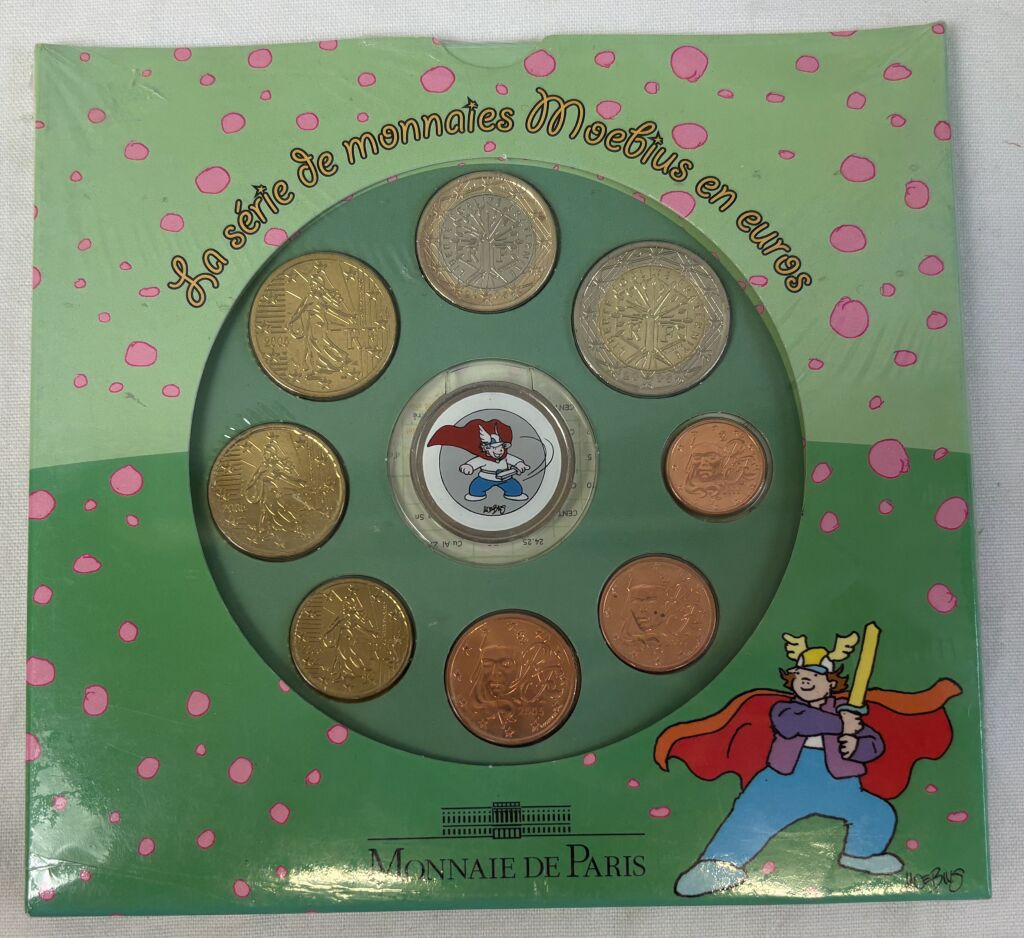 FRANCE - COFFRET FLEUR de COIN 2005 - TIRAGE SPECIAL bandes dessinées de MOEBIUS (Jean Giraud) - ensemble des 8 monnaies au millésime de la 1c à la 2 euros + la médaille spéciale personnage de Moebius - L'ensemble en leur coffret Monnaie de Paris, sous rétractable non déballé, aux décors des personnages crées par Jean GIRAUD.